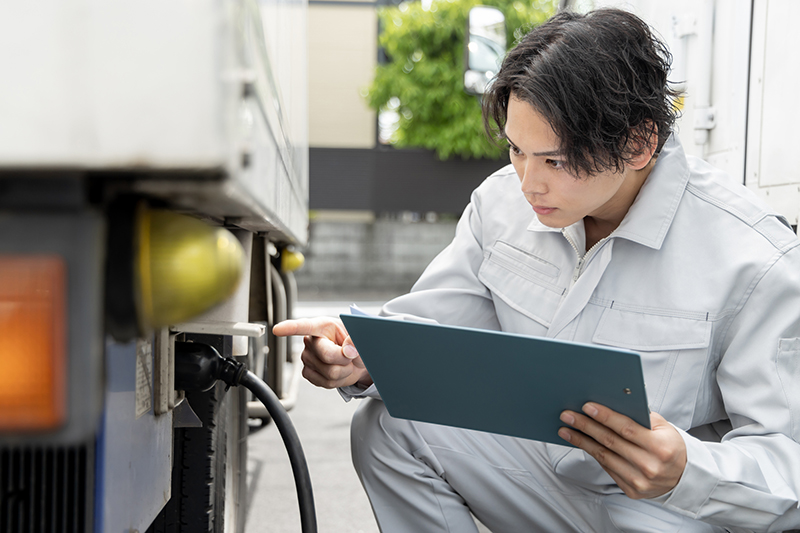 朝礼時、全体の点呼実施に加え、ドライバーのアルコールチェック、健康状態の確認を毎日行い、一日安全に運転できるよう取り組んでおります。また、交通事故を未然に防止するために、弊社マニュアルに基づき、出発前に車両の点検を行っています。